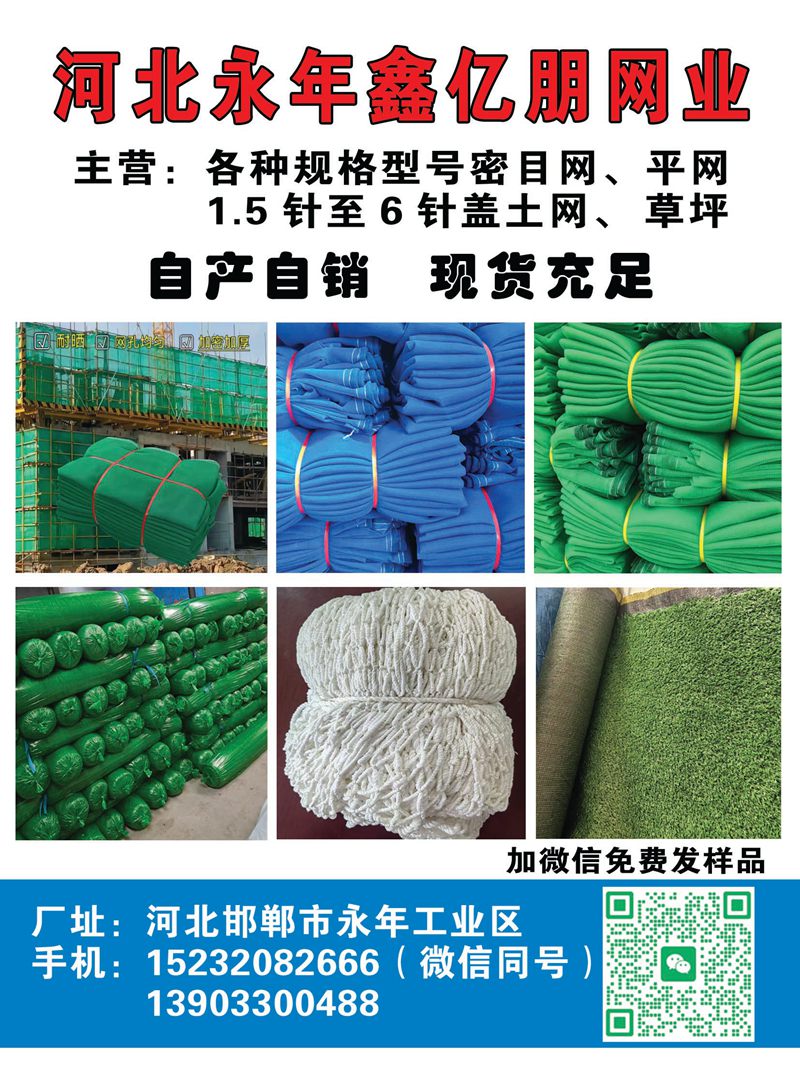 主营:各种规格型号密目网、平网2.5针至6针盖土网、草坪,密目式绿网,安全网,盖土绿网,防尘网,安全白网