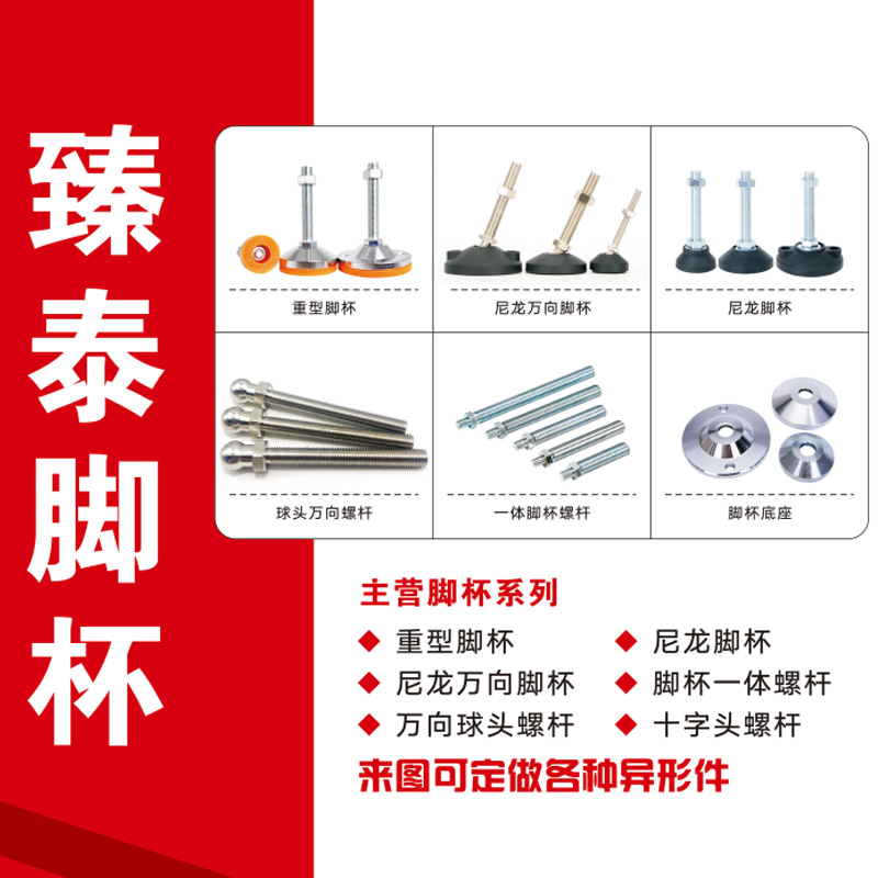 主营脚杯系列:重型脚杯、尼龙脚杯、尼龙万向脚杯、脚杯一体螺杆、万向球头螺杆、十字头螺杆、脚杯底座