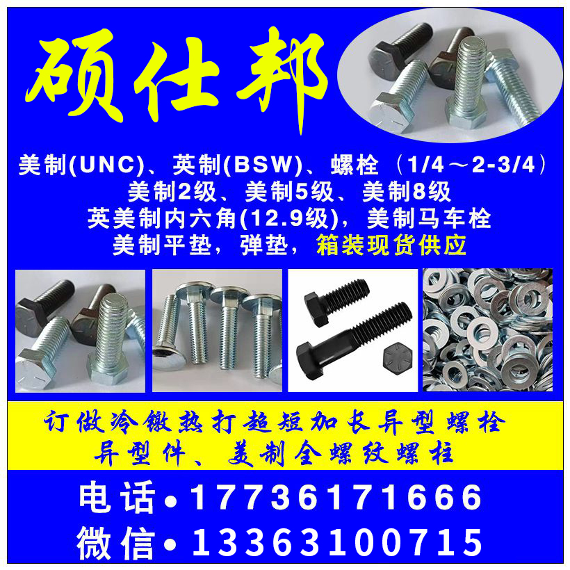 主营:美制螺栓(UNC)、英制螺栓(BSW)、(1/4~2-3/4)、美制2级螺丝、美制5级螺丝、美制8级螺丝、美制英制内六角(12.9级)螺丝,美制马车螺栓、美制平垫,美制弹垫,本色镀锌