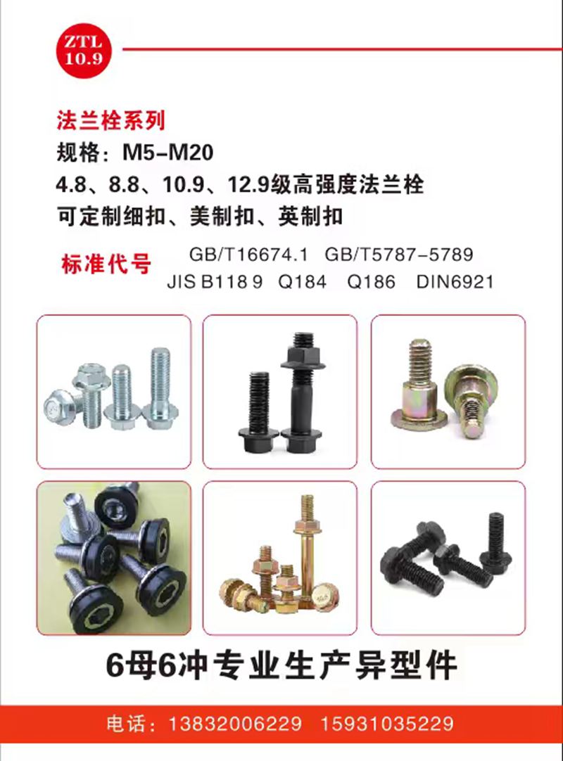 4.8法兰栓、8.8法兰螺钉、10.9法兰螺丝、12.9级高强度法兰栓、细扣法兰螺栓、美制扣法兰栓、英制扣法兰栓、8.8级法兰栓、10.9级法兰螺丝、加长法兰面外六角螺栓、镀彩法兰栓、镀锌法兰栓、高强度法兰螺丝、六角法兰面螺栓、自切锚栓、水泥锚栓、排气管螺丝、气标螺丝