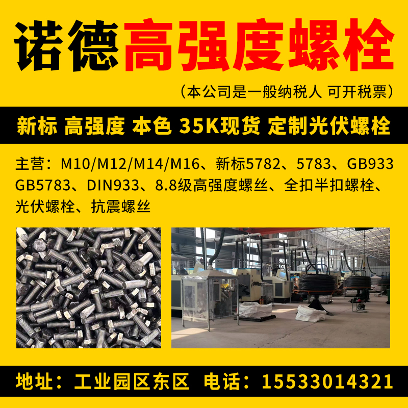 主营:M10、M12、M14、M16新标5782、5783、GB933、GB5783、DIN933、8.8螺栓、高强度螺丝、全扣螺栓、半扣螺栓、光伏螺栓、抗震螺丝