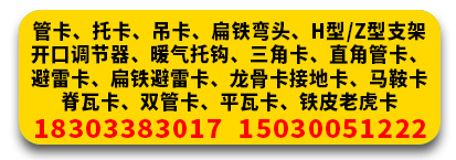 主营:避雷卡、国标管卡、膨胀托卡、龙骨卡、L型避雷卡、7字吊头、骑马卡、正圆吊卡、双管卡、避雷卡、平瓦卡、弹簧卡、管束卡、合页吊卡、 三角卡、装饰帽、脊瓦卡、直角管卡、铁皮老虎卡、扁铁弯头、 C型开口调节器、H型、Z型支架、暖气托钩、丝杠挂钩、7字钉、水泥避雷墩