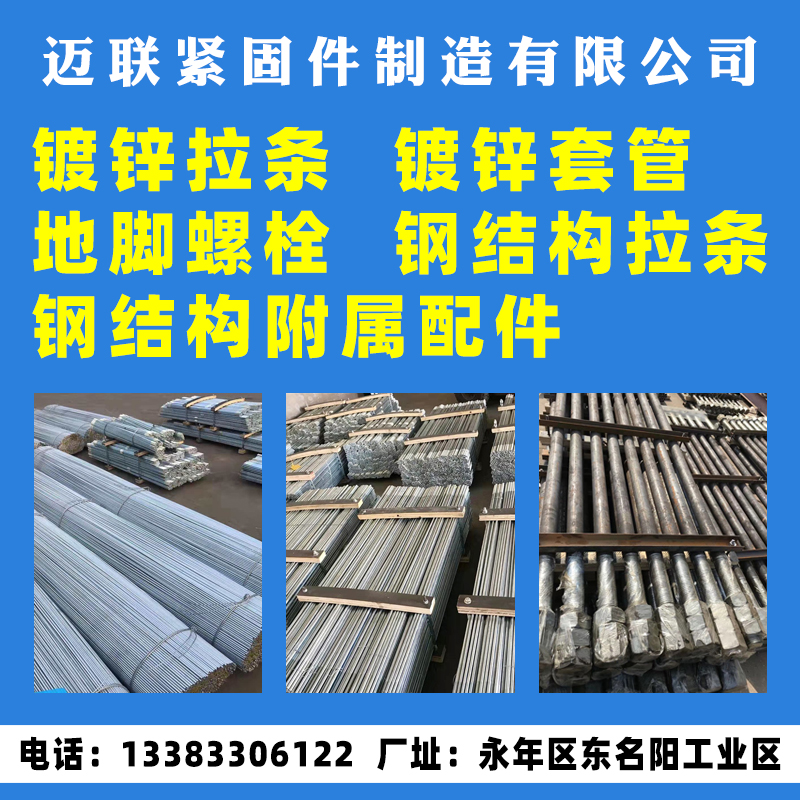 主营:钢结构拉条、镀锌拉条,光伏拉条,直拉条 ,斜拉条,地脚螺栓、地脚丝,地脚螺丝、地脚栓、钢结构附属配件,镀锌套管,套管