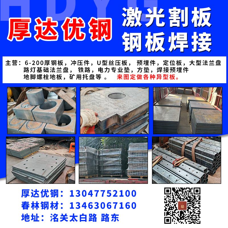 主营:6-200厚钢板,冲压件,U型丝压板, 预埋件,定位板,大型法兰盘,路灯基础法兰盘, 铁路,电力专业垫,方垫,焊接预埋件,地脚螺栓地板 矿用托盘等