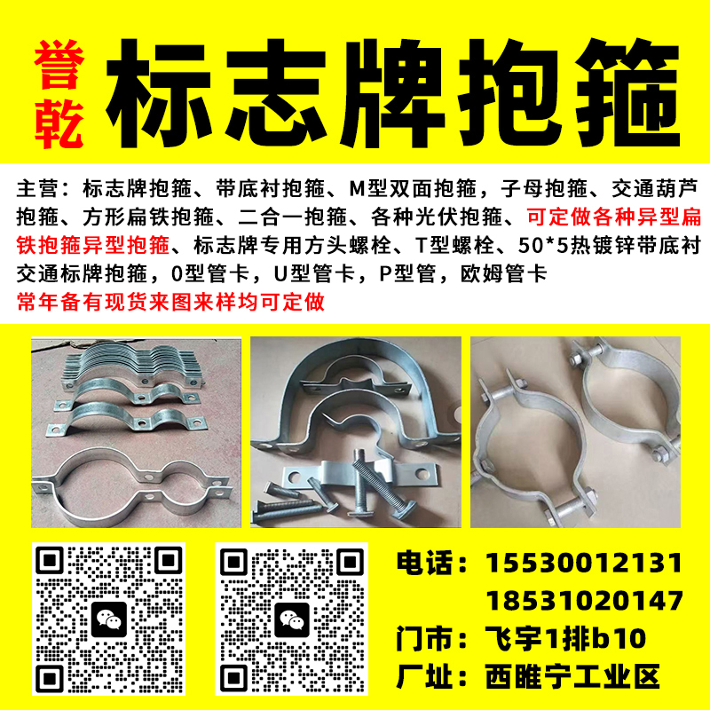 主营:标志牌抱箍、带底衬抱箍、M型双面抱箍,子母抱箍、交通葫芦抱箍、方形扁铁抱箍、二合一抱箍、各种光伏抱箍、可定做各种异型扁铁抱箍异型抱箍