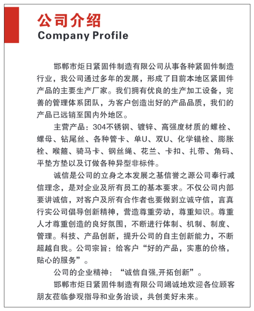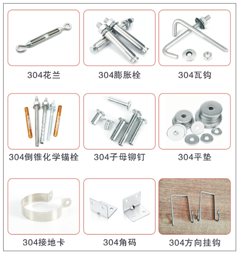 主营:、304T型卡,304花瓣螺母,尼龙块螺母,塑钢线,D型环,塑料链条、不锈钢螺栓、不锈钢螺母、不锈钢猪场配件、不锈钢钻尾丝、不锈钢管卡、不锈钢单U、不锈钢双U、不锈钢化学锚栓、不锈钢膨胀栓、不锈钢喉箍、不锈钢骑马卡、不锈钢钢丝绳、不锈钢花兰螺栓、不锈钢卡扣、不锈钢扎带、不锈钢角码、304螺栓、304自锁螺母、304六角螺母、304盖母、304盘头内六、304盘头十字、410钻尾丝、304扎带、尼龙块螺母、304单U、304双U、304方卡、304挡板、304骑马卡、304喉箍、304钢丝绳、304卡头、304R线夹、304花兰、304膨胀栓、304瓦钩、304倒锥形化学锚栓、304字母铆钉、304平垫、304接地卡、304角码、304方向挂钩、热渗锌螺栓、热渗锌双U、热渗锌单U、热镀锌角码、热镀锌方垫、热镀锌102抱箍、热镀锌圆抱箍、304方形抱箍、10.9级钢结构螺栓、304膨胀钩、达克罗螺栓、304法兰螺栓、铝制拉铆钉、304挡板、304T型卡、铜锁线器、D形环、朱丹扣、不锈钢板、304压板、304拉爆、塑料链条、304旗形合页、指定炮钉、指定钻尾丝、304灯笼螺母、尼龙扎带、尼龙母、304饮水杆固定件、304变径管接、热镀锌通槽固定件、304卡簧、热镀锌角码、吊顶挂钩、304强力箍、304链条、塑钢线、304胶条骑马卡、加大平垫、不锈钢变径