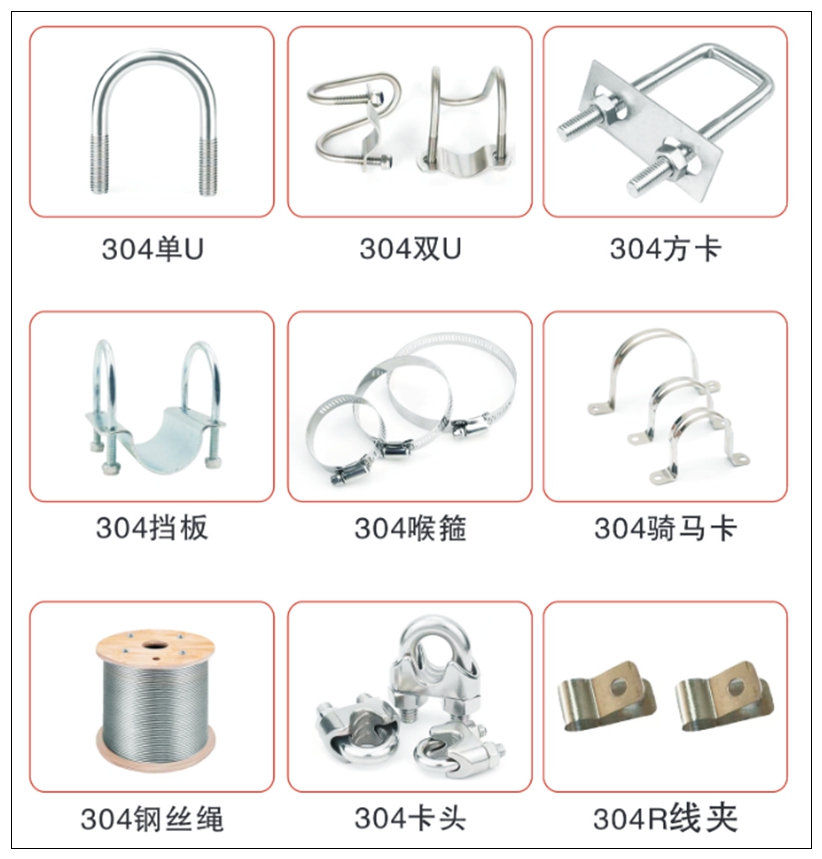 主营:不锈钢T型卡,不锈钢花瓣螺母,尼龙块螺母,塑钢线,D型环,塑料链条、不锈钢猪场配件、不锈钢钻尾丝、不锈钢管卡、不锈钢单U、不锈钢双U、不锈钢化学锚栓、不锈钢膨胀栓、不锈钢喉箍、不锈钢骑马卡、不锈钢钢丝绳、不锈钢花兰螺栓、不锈钢扎带、不锈钢角码、加大平垫、不锈钢变径
