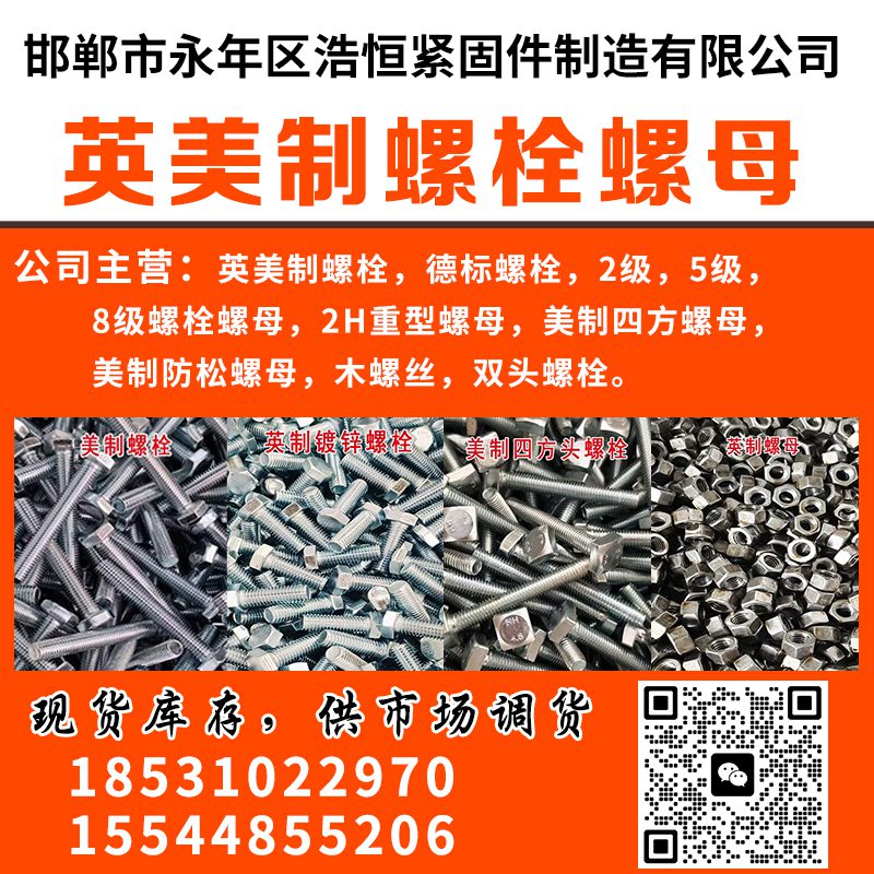 公司主营:英美制螺栓,德标螺栓,2级,5级,8级螺栓螺母,2H重型螺母,美制四方螺母,美制防松螺母,木螺丝,双头螺栓,高强度螺栓