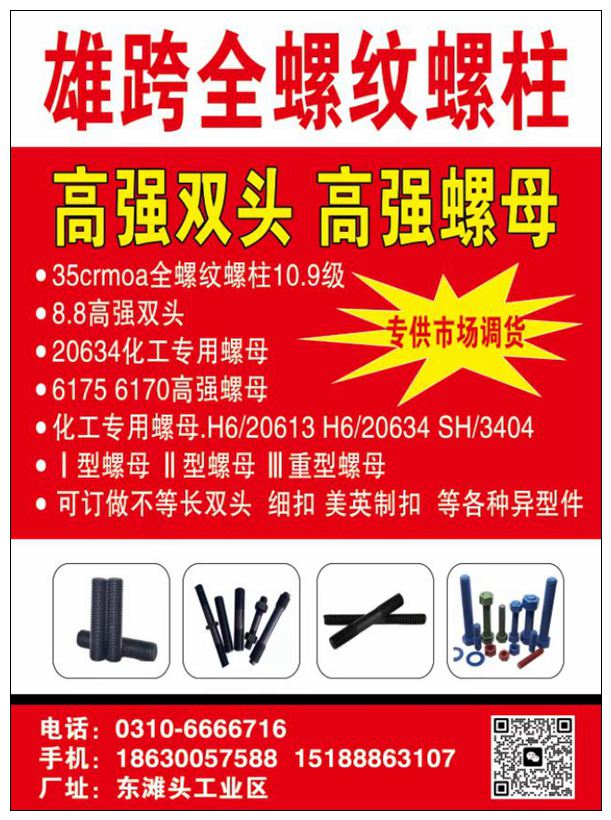 主营:35crmoa全螺纹螺柱、4.8级、8.8级、10.9级、12.9级高强度双头、20634化工专用螺母、6175高强螺母、6170高强螺母、HG20613、HG20634、SH3404系列双头螺栓、全螺纹螺柱及配套螺母、|型螺母、‖型螺母、‖|重型螺母