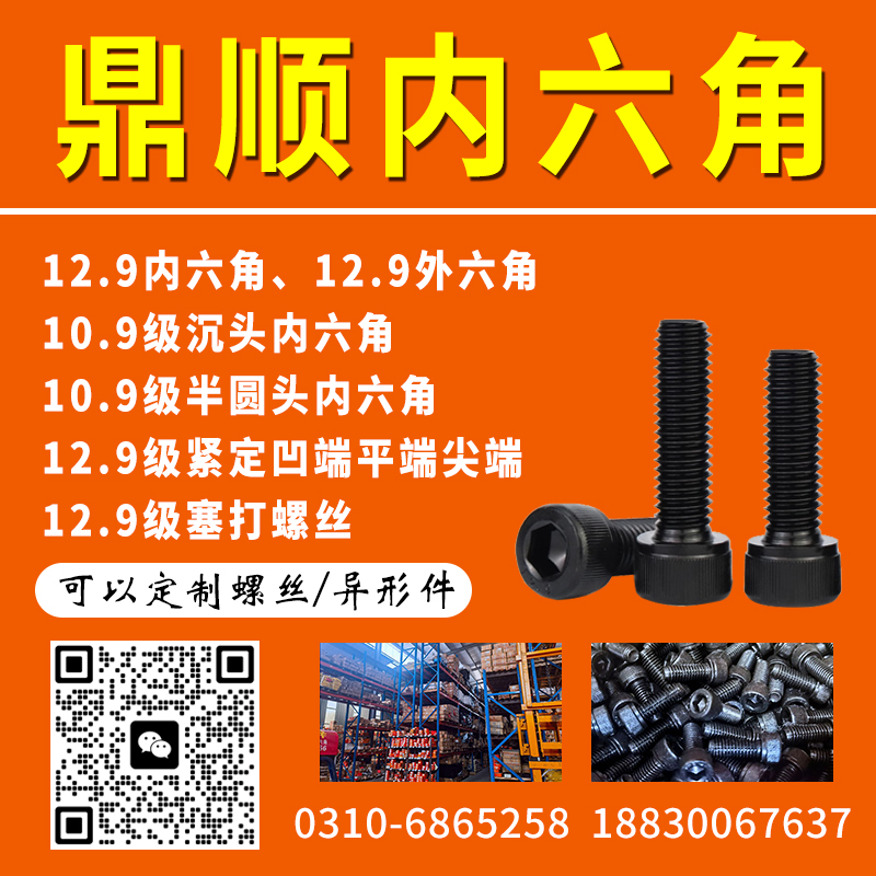 主营:12.9内六角螺栓、12.9级外六角螺栓、10.9级沉头内六角螺栓、10.9级半圆头内六角螺栓、12.9级紧定凹端、12.9级紧定平端、12.9级紧定尖端、12.9级塞打螺栓