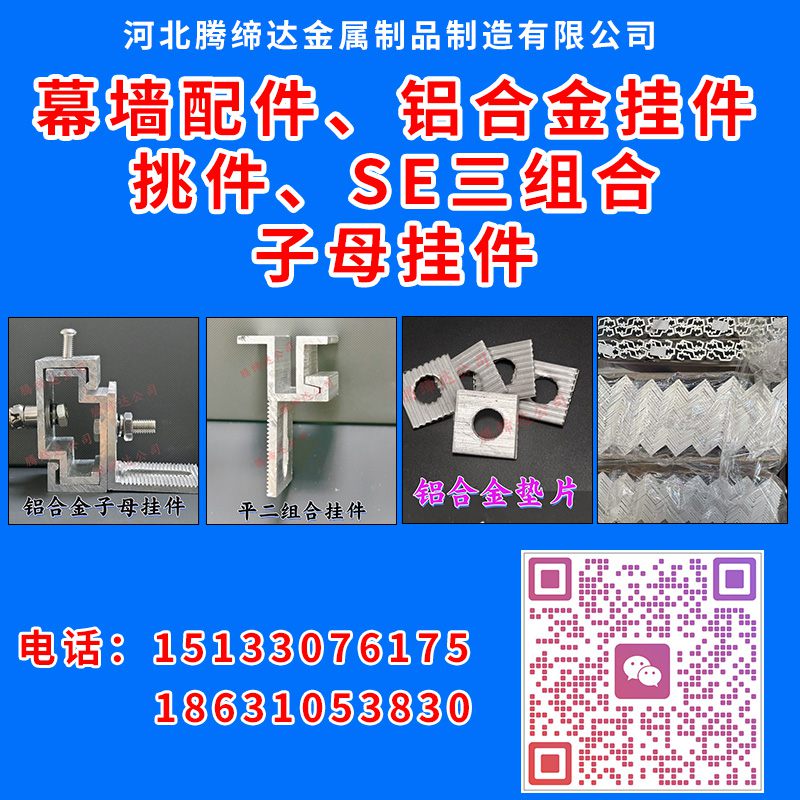 主营:幕墙配件、铝合金挂件、挑件、SE三组合、子母挂件