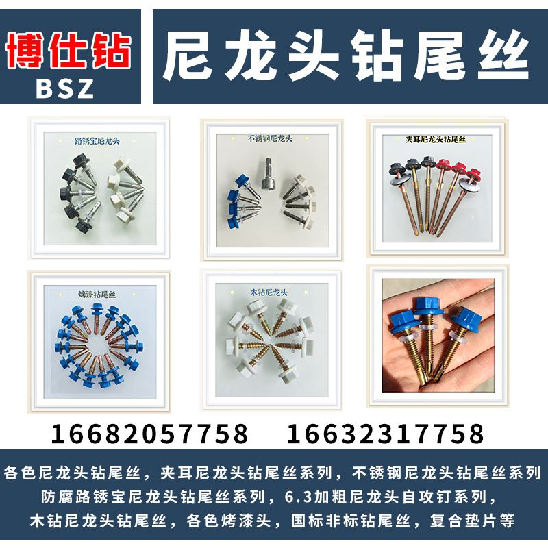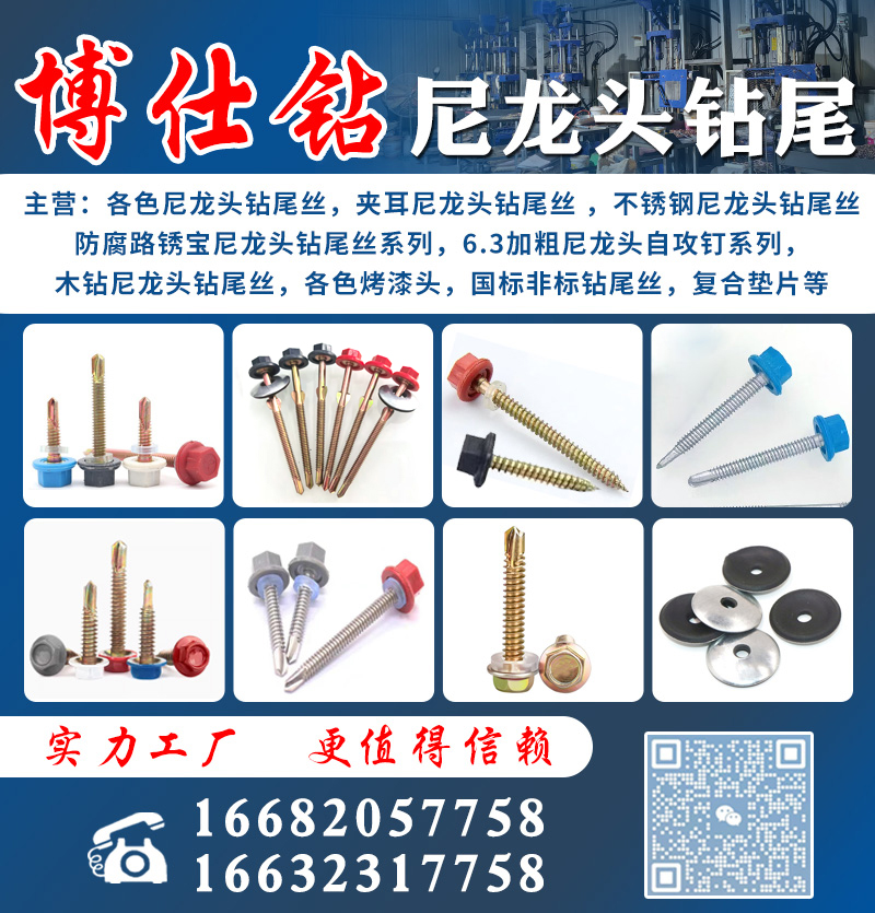 主营产品:各色尼龙头钻尾丝,夹耳尼龙头钻尾丝系列,不锈钢尼龙头钻尾丝系列,防腐路锈宝尼龙头钻尾丝系列,6.3加粗尼龙头自攻钉系列,木钻尼龙头钻尾丝,各色烤漆头,国标非标钻尾丝,复合垫片等