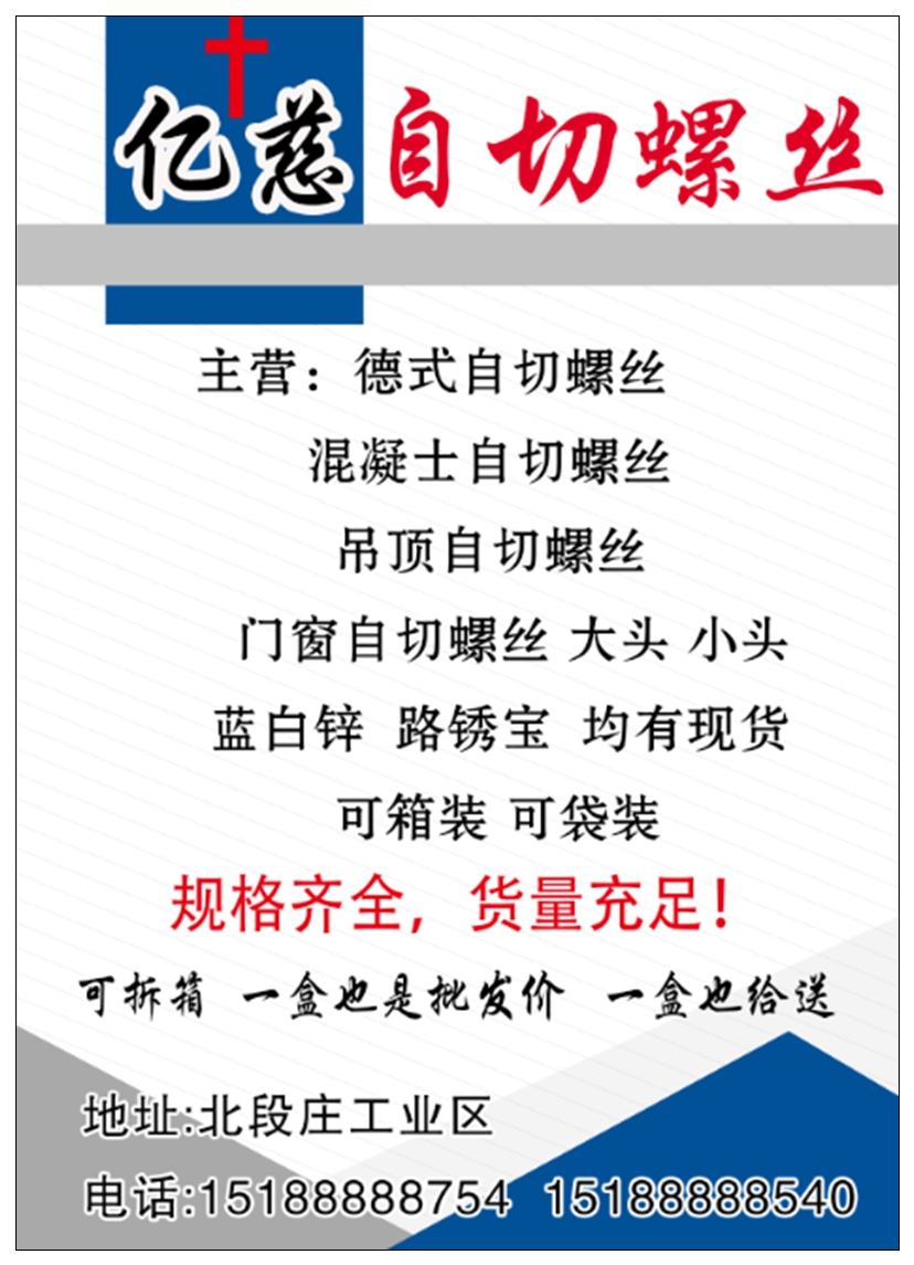 主营:德式自切螺钉,混凝土自切螺钉,吊顶自切螺钉、门窗自切螺钉