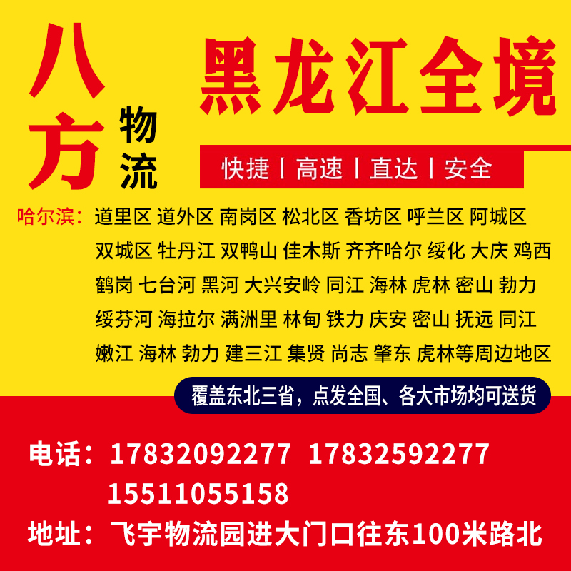 哈尔滨:道里区、道外区、南岗区、松北区、香坊区、呼兰区、阿城区、双城区、牡丹江、双鸭山、佳木斯、齐齐哈尔、绥化、大庆、鸡西、鹤岗、七台河、黑河、大兴安岭、同江、海林、虎林、密山、勃力、绥芬河、海拉尔、满洲里、林甸、铁力、庆安、密山、抚远、同江、嫩江、海林、勃力、建三江、集贤、尚志、肇东、虎林等周边地区货往返运输
