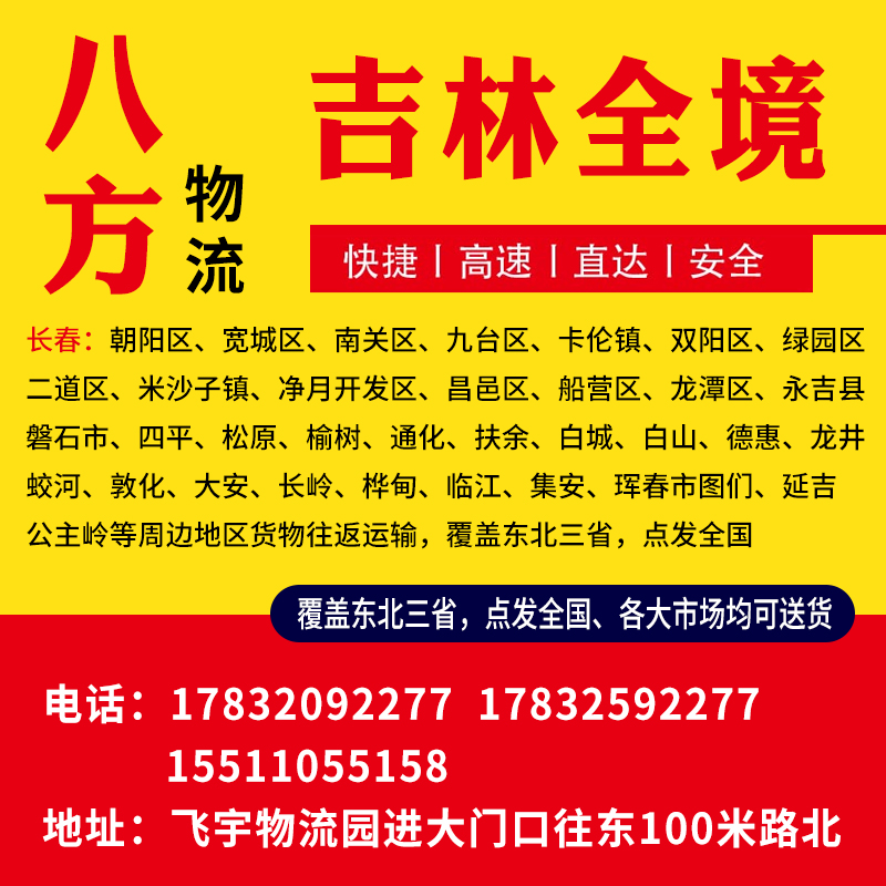 长春:朝阳区、宽城区、南关区、九台区、卡伦镇、双阳区、绿园区、二道区、米沙子镇、净月开发区、昌邑区、船营区、龙潭区、永吉县、磐石市、四平、松原、榆树、通化、扶余、白城、白山、德惠、龙井、蛟河、敦化、大安、长岭、桦甸、临江、集安、珲春市、图们、延吉、公主岭等周边地区货物往返运输