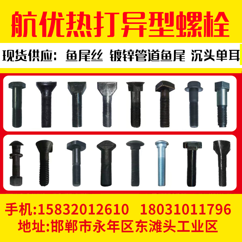 可订做:M8-M36,8.8级,10.9级,12.9级沉头带榫,T型栓,马车栓,犁尖丝,梅花丝,四方,斗型丝,鹅蛋丝,元宝丝,扇面丝等各种异型螺栓,