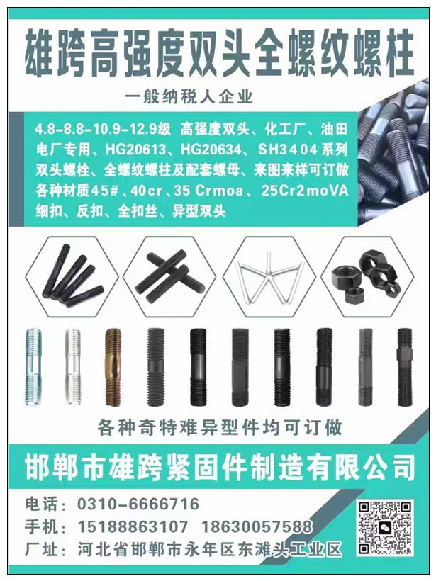 主营:35crmoa全螺纹螺柱、4.8级、8.8级、10.9级、12.9级高强度双头、20634化工专用螺母、6175高强螺母、6170高强螺母、HG20613、HG20634、SH3404系列双头螺栓、全螺纹螺柱及配套螺母、|型螺母、‖型螺母、‖|重型螺母
