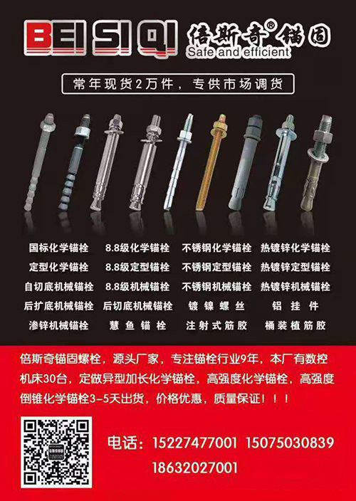 国标化学锚栓 、8.8级化学锚栓 、不锈钢化学锚栓、 热镀锌化学锚栓 、定型化学锚栓 、8.8级定型锚栓 、不锈钢定型锚栓、热镀锌定型锚栓、自切底机械锚栓 、8.8级机械锚栓、 不锈钢机械锚栓 、热镀锌机械锚栓、后扩底机械锚栓 、后切底机械锚栓 、镀镍螺丝 、铝挂件、渗锌机械锚栓 、慧鱼锚栓 、注射式筋胶 、桶装植筋胶、倍斯奇锚固螺栓