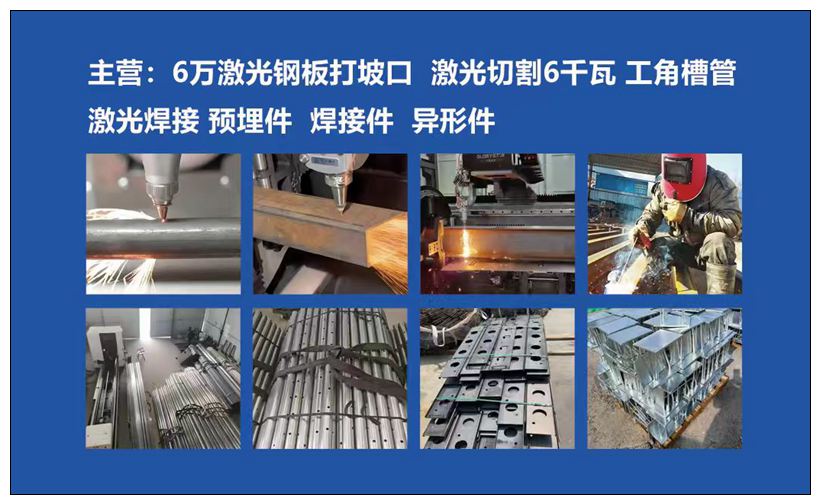 主营:激光割管、激光切管、激光割方管、激光切方管、激光割角钢、激光切角钢、激光割槽钢、激光切槽钢、激光割工字钢、激光切工字钢、激光割H型钢、激光切H型钢、圆管加工、方管加工、角钢加工、槽钢加工、工字钢加工。激光切割.管材加工、管材截断、管材打孔、冲压件、冲压折弯.定位板、预埋件、地脚螺栓、光伏螺栓、光伏地桩、高速公路立柱、建筑配件、电力金具、工矿配件、铁路配件、桥梁配件。电镀锌热镀锌对外加工等