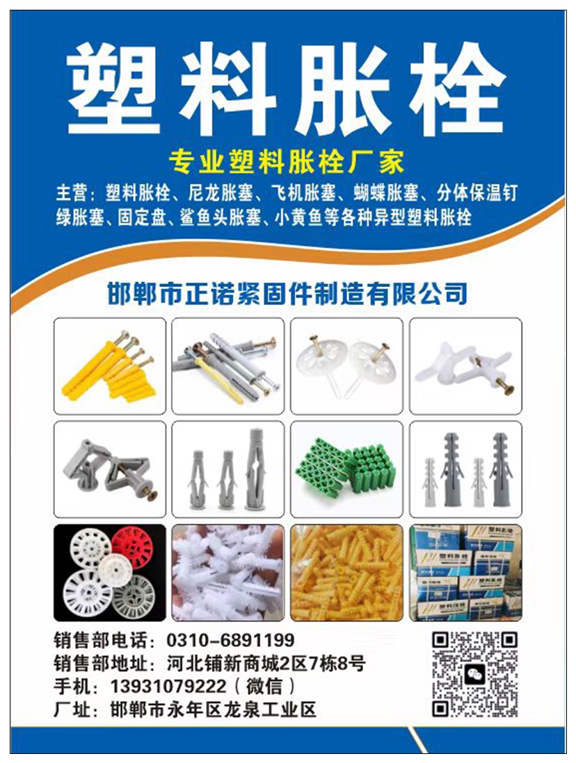 主营:尼龙胀栓、塑料胀栓/塑料膨胀螺栓、塑料胀塞、连体保温胀栓、固定盘、飞机胀塞、鲨鱼头胀塞、绿胀管、小黄鱼膨胀,塑料涨塞,尼龙胀塞,