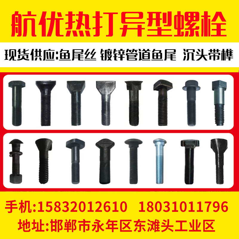 可订做:M8-M30,8.8级,10.9级,12.9级沉头带榫,T型栓,马车栓,犁尖丝,梅花丝,四方,斗型丝,鹅蛋丝,元宝丝,扇面丝等各种异型螺栓,