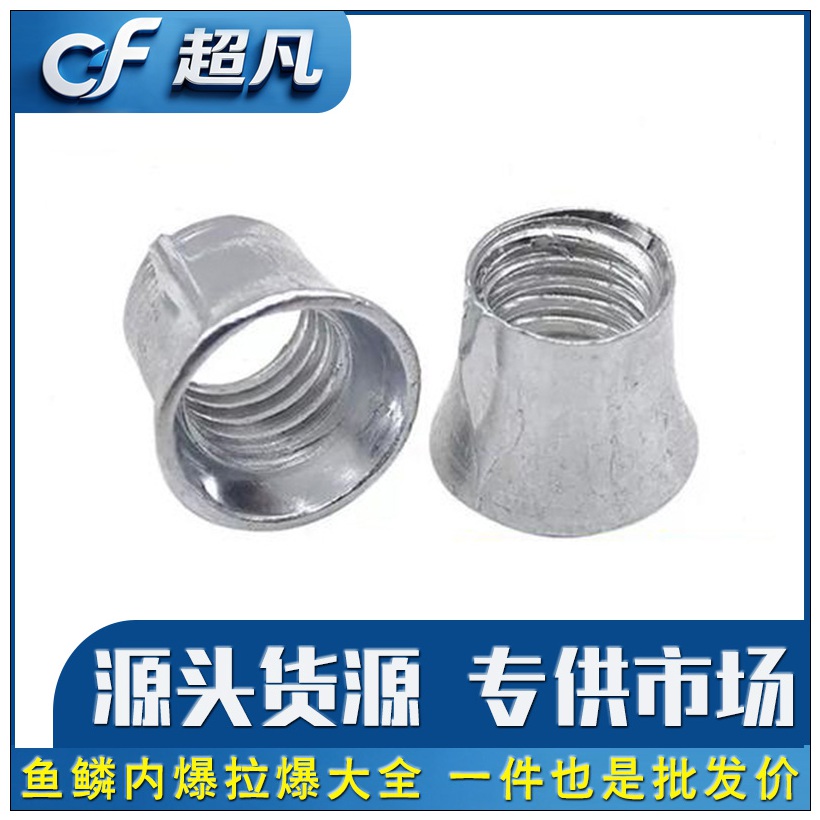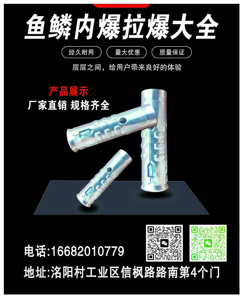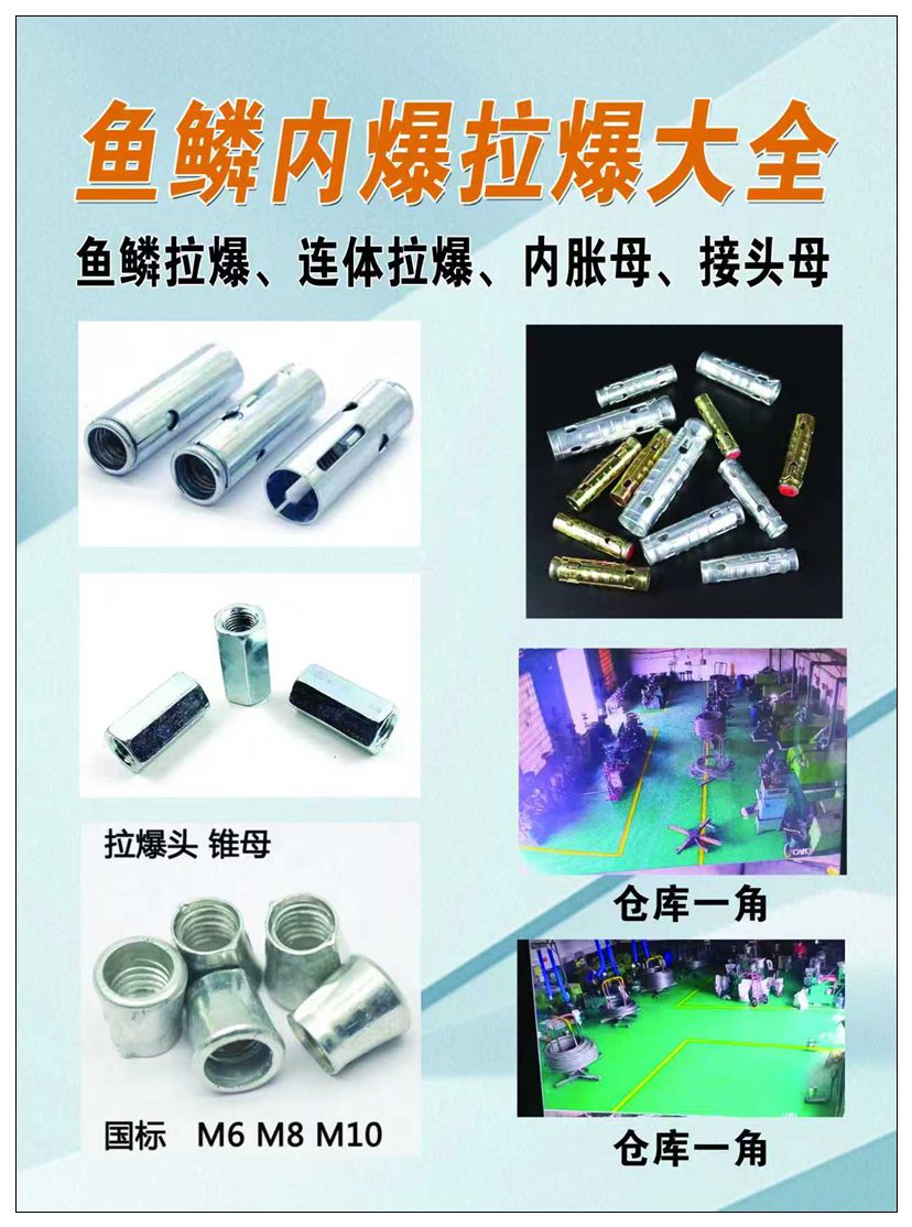 主营:鱼鳞拉爆膨胀、连体拉爆膨胀、内爆膨胀螺栓、内胀母、接头螺母、接头母、加厚螺母、拉爆头、锥母、带孔拉爆膨胀