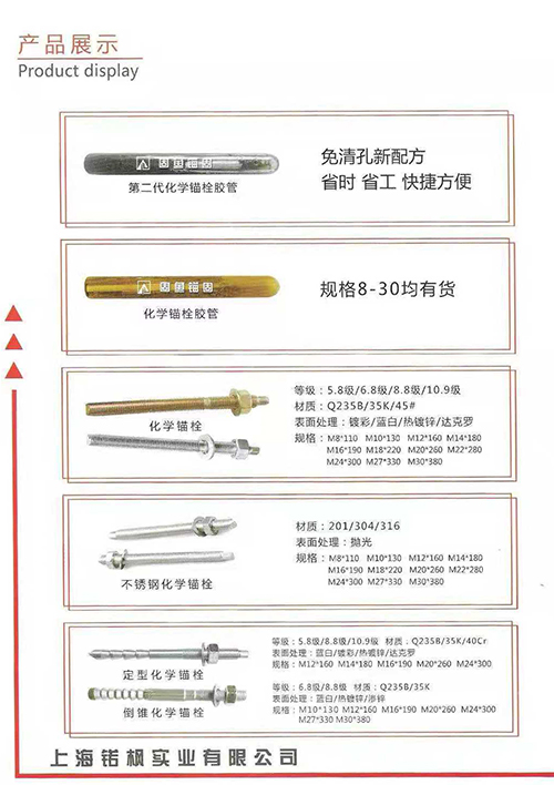 主营:上海固鱼牌化学锚栓、上海特力顿化学锚栓、机械锚栓、化学锚栓、定型化学锚栓、倒锥型锚栓、化学胶管/药水、后扩底机械锚栓、自切底机械锚栓、加长锚栓、不锈钢锚栓、高强度锚栓、特力顿化学锚栓、水钻膨胀螺栓、膨胀螺栓、注射式植筋胶、建筑结构胶、机械锚栓专业扩孔钻头