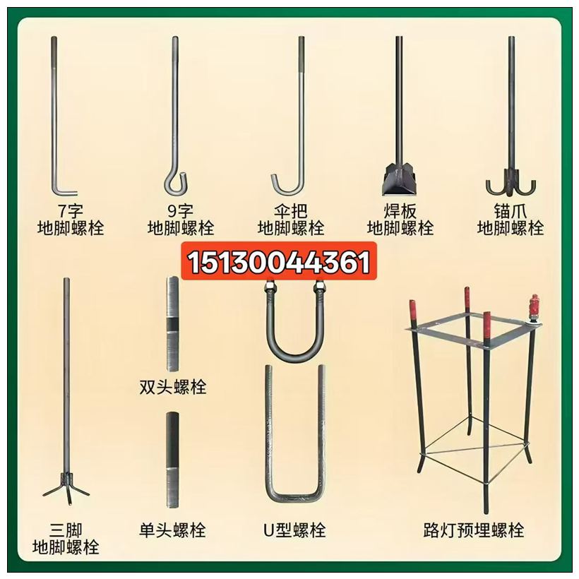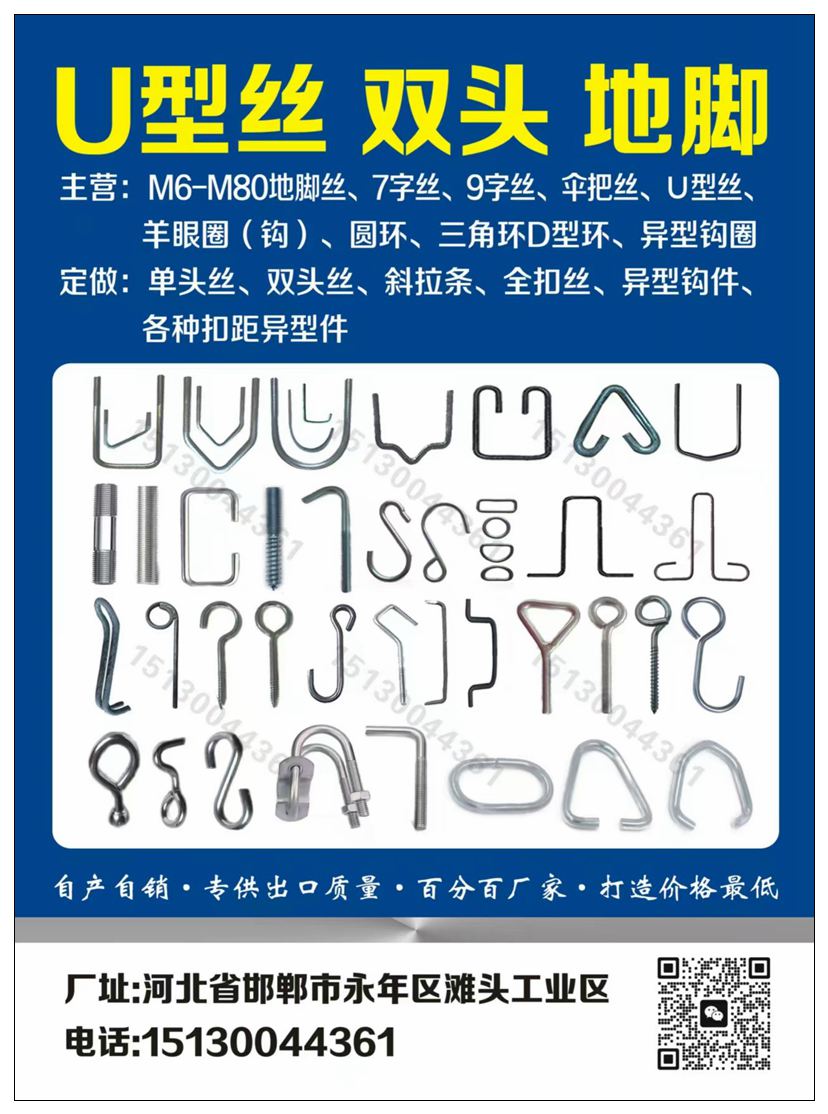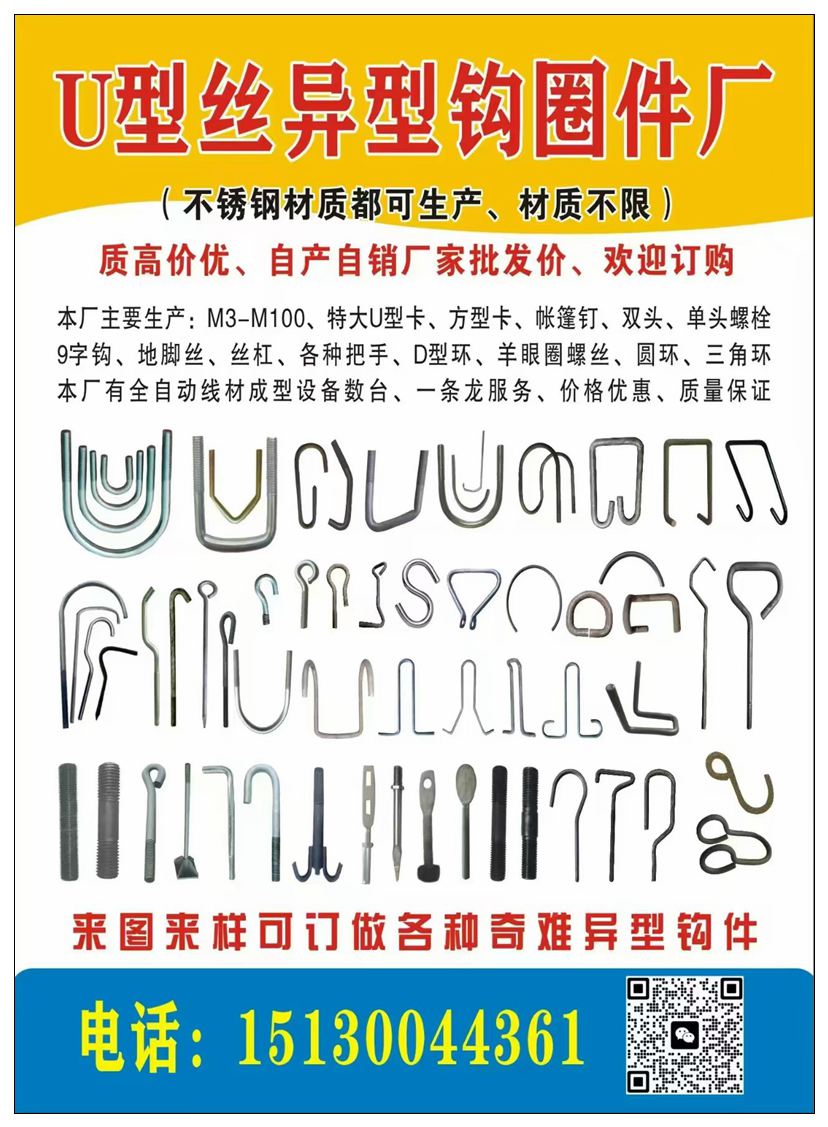 本厂主要生产:羊眼圈(钩)、U型卡,U型丝、方型卡、帐篷钉、9字钩、S钩、M6-M80地脚丝、7字丝、9字丝、伞把丝、,三角头螺栓、吊环、重型拖车钩、拉线棒、拍扁头螺栓、丝杠、各种把手、D型环、圆环,三角环,冷镦热打异型件、建筑配件等