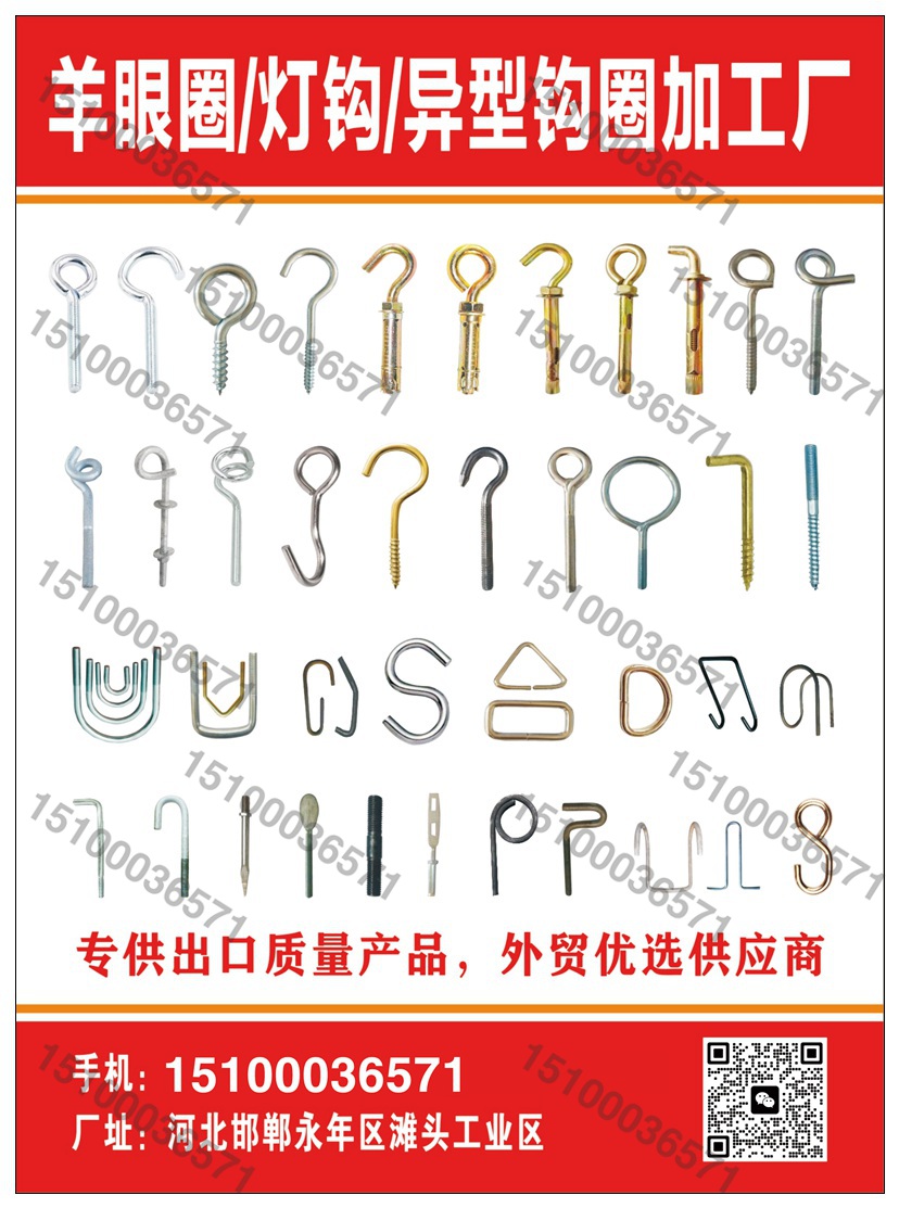 本厂专业生产英制,美制,羊眼圈,灯勾,冲孔,压勾,瓦勾,羊眼钉,吊环,拍扁螺丝,木牙羊眼圈,羊眼圈膨胀壁虎,热水器勾,焊接缩杆羊眼圈,羊眼钉,猪尾勾,帐篷钉,折钉,S勾,D形环,方形环,三角环,圆环,拍扁折钉,机木双头,瓦勾丝,自攻钉,地钉,帐篷地钉,弹簧,把手,三角头螺丝,光伏配件,光伏U形卡,U形丝,地脚螺丝,预埋件,异形件等各种异型钩圈件非标件