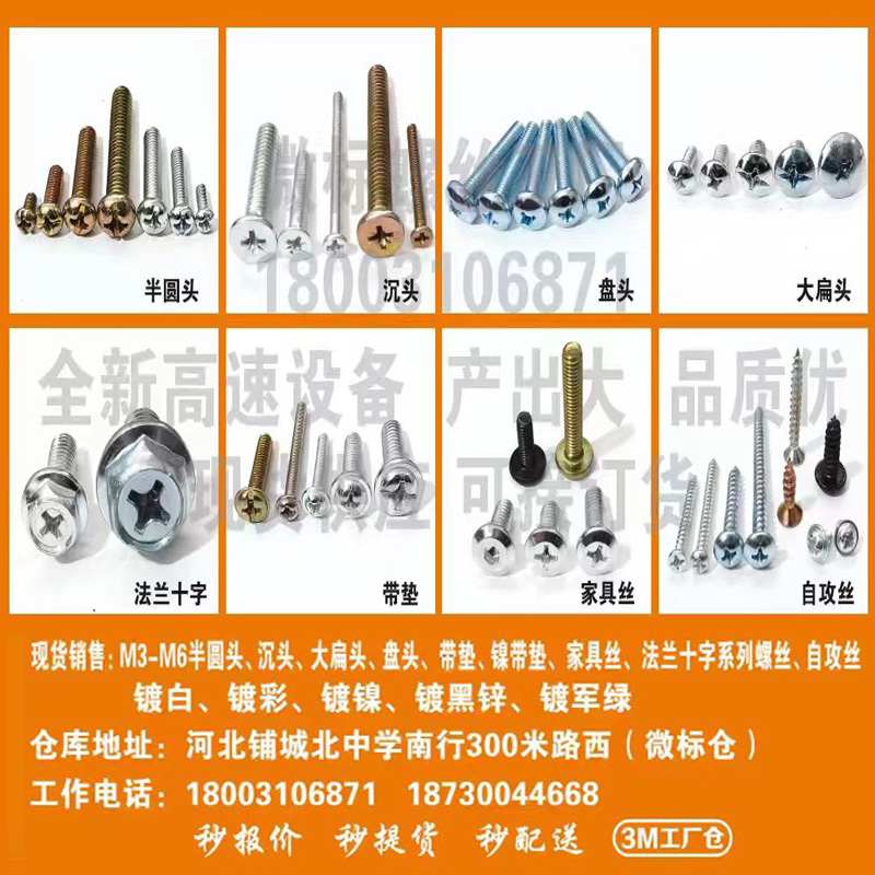 现货销售:M3-M6半圆头、沉头、大扁头、盘头、镍带垫、家具丝、法兰十字系列螺丝、自攻丝