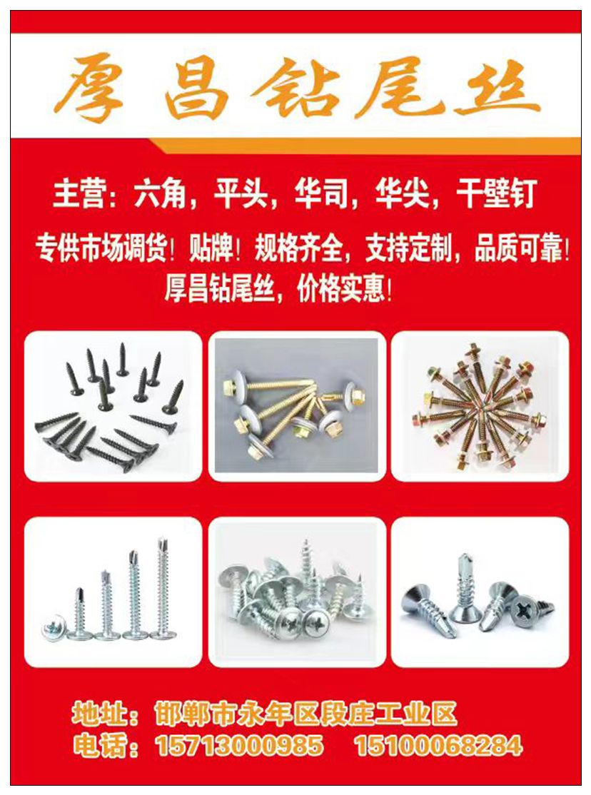 主营:六角头钻尾螺丝、平头钻尾丝、华司头钻尾螺丝、华尖钻尾螺丝、六角钻尾丝、六角钻尾螺丝、沉头钻尾丝、沉头钻尾螺丝、盘头钻尾丝、盘头钻尾螺丝、燕尾螺钉、干壁钉