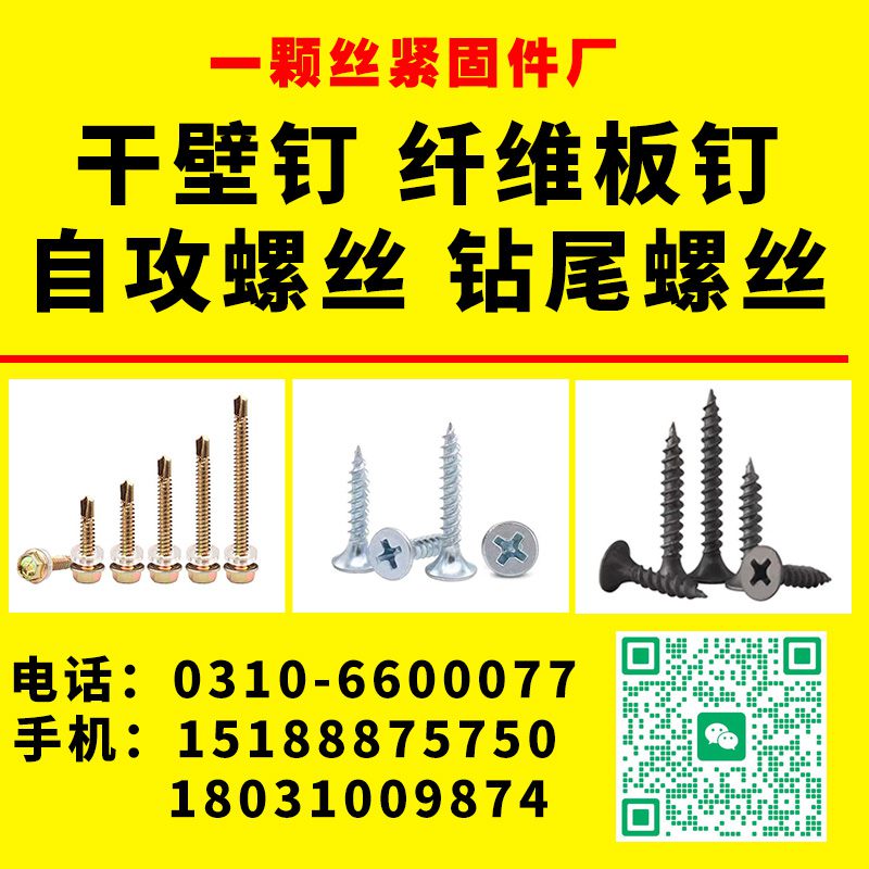 厂家主营:干壁钉、纤维板钉、自攻螺钉、六角钻尾丝、平头钻尾丝、华司钻尾丝、粗牙干壁钉、水泥自切螺钉、拉铆钉,抽芯铆钉,半空心铆钉,不锈钢小刀口钻尾螺丝,防腐EDPM复合垫钻尾螺丝,防水盖帽,加长木钻尾丝,门窗自攻螺丝,微型小螺钉