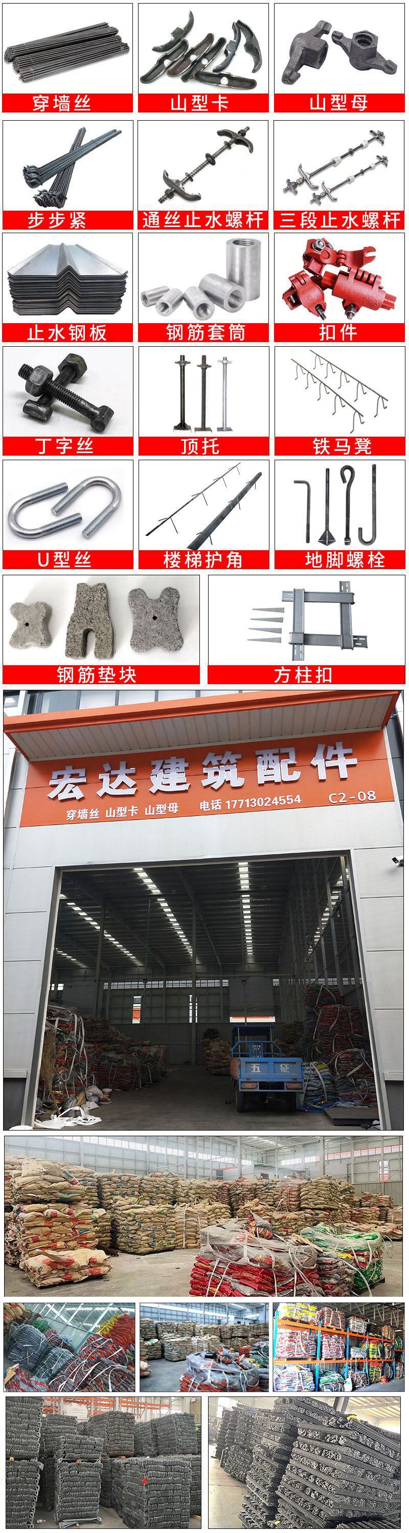 主营:穿墙丝、穿墙螺丝,山型卡、山形卡、山形母、山型母、通丝止水螺杆、止水螺丝、三段止水螺杆 止水杆,三段水螺杆、丁字丝、止水钢筋筒、螺纹套,钢筋连接筒扣件、步步紧、顶托、铁马登、U型丝、楼梯护角、地脚螺栓、钢筋垫块/梅花水泥垫块、方柱扣