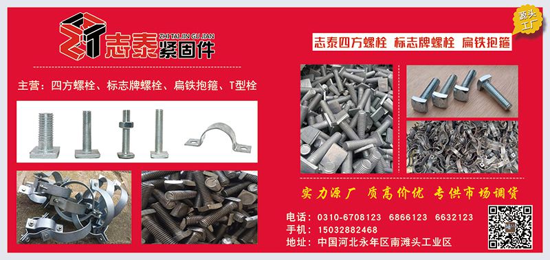 主营:方头螺栓、四方螺栓、扁铁抱箍、T型栓、标志牌螺栓、标志牌抱箍、热打异型螺栓等