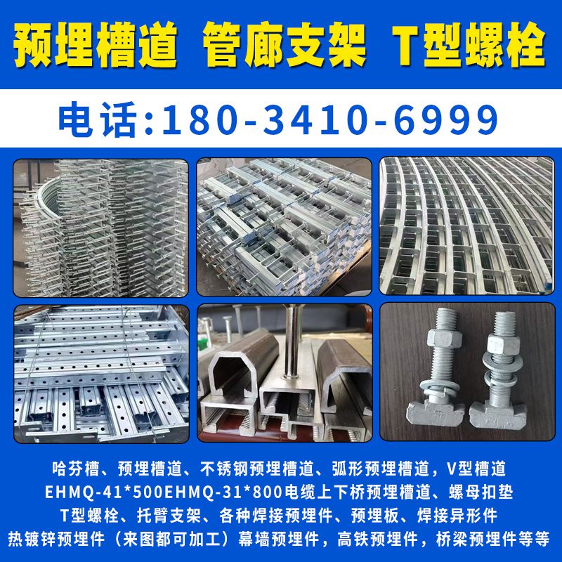 主营:哈芬槽、预埋槽道、不锈钢预埋槽道、弧形预埋槽道,V型槽道、EHMQ-41*500EHMQ-31*800电缆上下桥预埋槽道、螺母扣垫、T型螺栓、托臂支架、各种焊接预埋件、预埋板、焊接异形件、热镀锌预埋件(来图都可加工)幕墙预埋件,高铁预埋件,桥梁预埋件等等