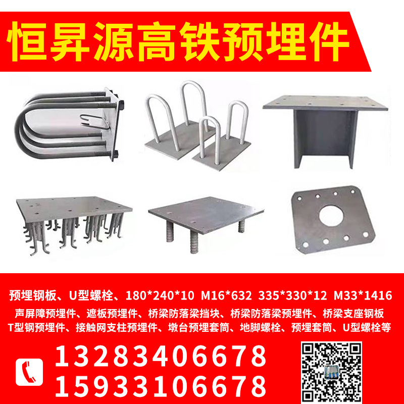 声屏障预埋件、遮板预埋件、桥梁防落梁挡块、桥梁防落梁预埋件、桥梁支座钢板、T型钢预埋件、接触网支柱预埋件、墩台预埋套筒、地脚螺栓、预埋套筒、U型螺栓等