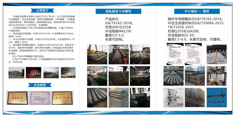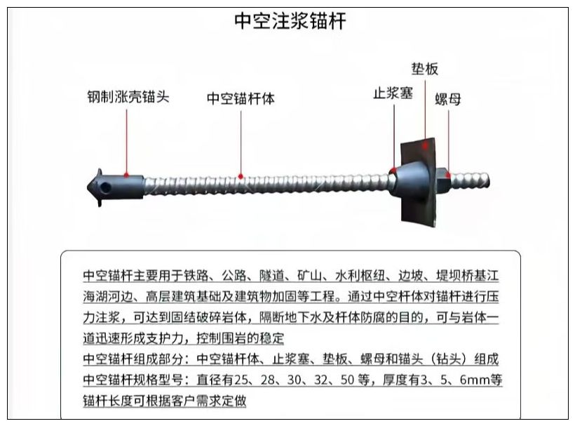 产品类型有:组合锚杆 、涨壳锚杆、自进式锚杆、中空注浆锚杆壁厚3-5mm 热# 钢 材质20#/Q355B,外径规格中42/50mm 壁厚3.0-5.0 外径规格42/50 外径规格22-50 材质Q355B/Q420B mm,厚3-6mm 二,中空注浆描杆及钢管